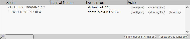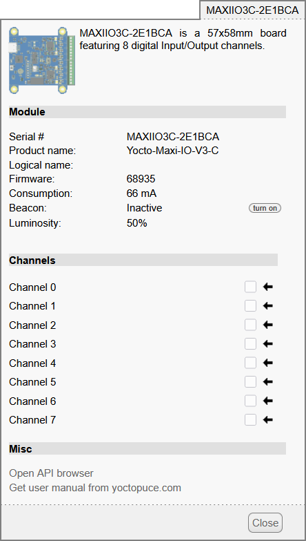 The first item to check is that your module is working well: click on the serial number corresponding to your module. This displays a window summarizing the properties of your Yocto-Maxi-IO-V3-C.