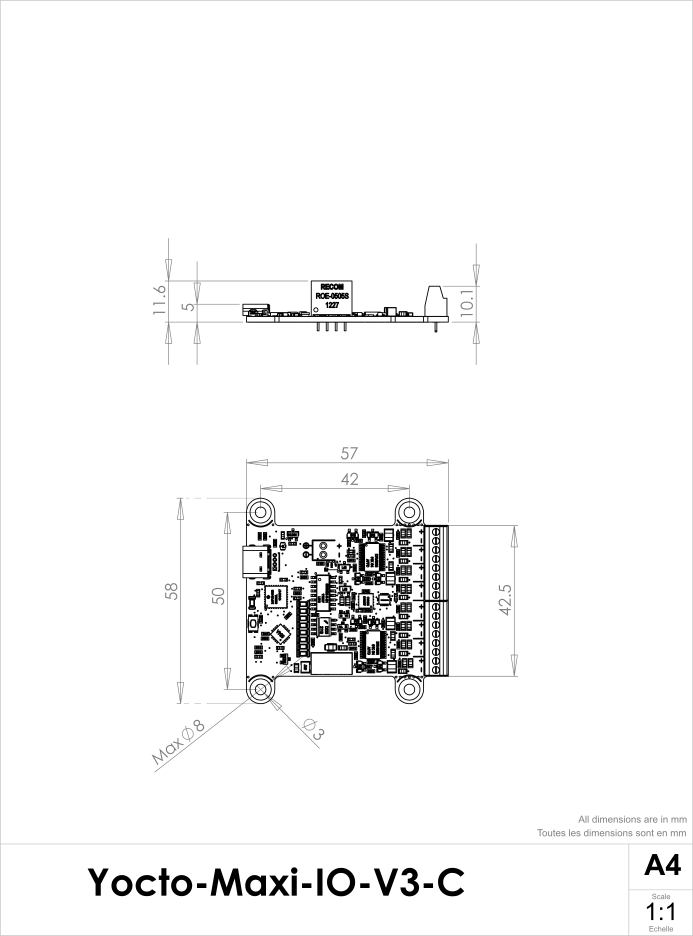 In order to mount the Yocto-Maxi-IO-V3-C module, you can put small screws in the 3mm assembly holes, with a screw head no larger than 8mm. The best way is to use threaded spacers, which you can then mount wherever you want. You can find more details on this topic in the chapter about assembly and connections.