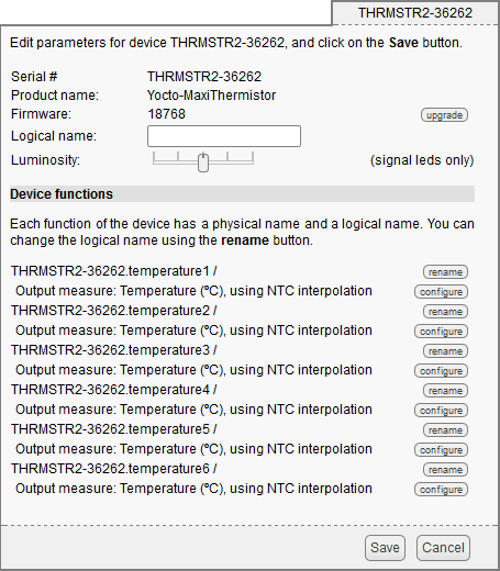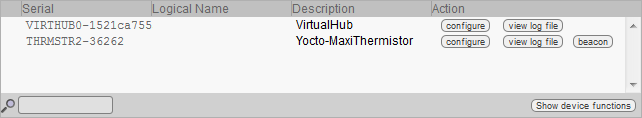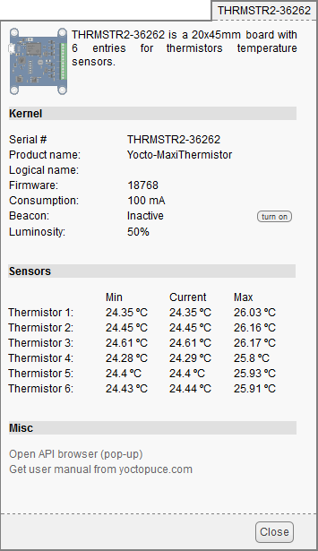 The first item to check is that your module is working well: click on the serial number corresponding to your module. This displays a window summarizing the properties of your Yocto-MaxiThermistor.