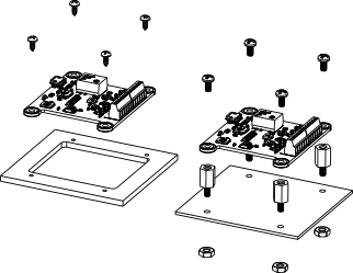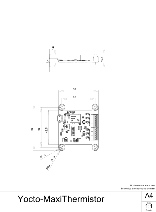In order to mount the Yocto-MaxiThermistor module, you can put small screws in the 3mm assembly holes, with a screw head no larger than 8mm. The best way is to use threaded spacers, which you can then mount wherever you want. You can find more details on this topic in the chapter about assembly and connections.