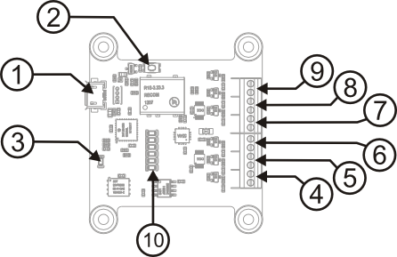 | 1: | Micro-B USB socket | 6: | Thermistor 3 connection |
