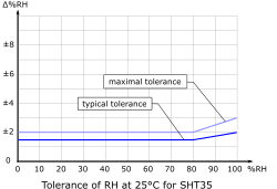 The absolute accuracy of the humidity measure is typically +/-1.5% between 0% and 80% relative humidity (with a resolution of 0.1%), or +/-2% up to 100% relative humidity. The maximal tolerance is documented in the graph below. The repeatability is 0.1 %RH.