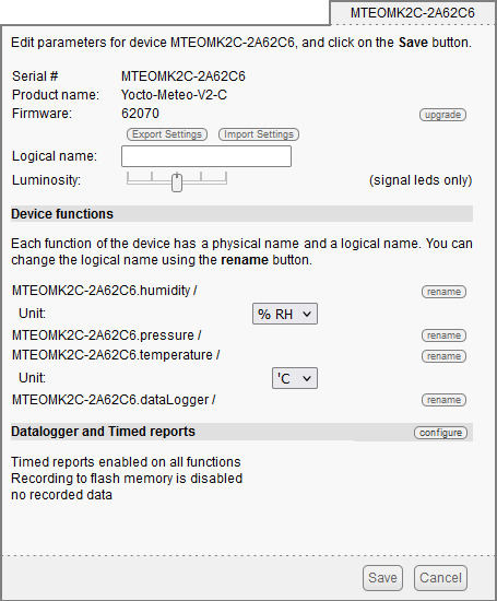 The Yocto-Meteo-V2-C module possesses three functions: "humidity", "temperature", and "pressure". Simply click on the corresponding "rename" button to assign it a new logical name.