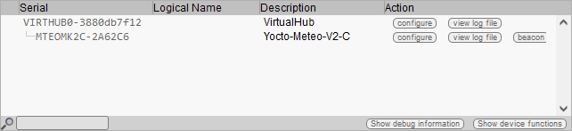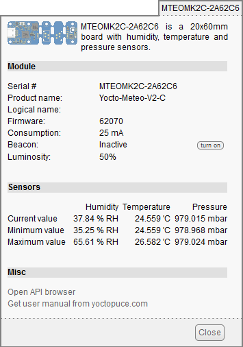 The first item to check is that your module is working well: click on the serial number corresponding to your module. This displays a window summarizing the properties of your Yocto-Meteo-V2-C.