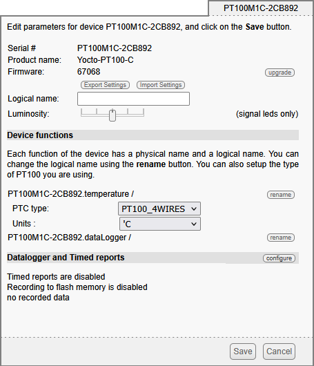 The functions provided by the Yocto-PT100-C module are the "temperature" and "datalogger". Simply click on the corresponding "rename" button to assign them new logical names.