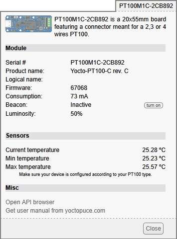 The first item to check is that your module is working well: click on the serial number corresponding to your module. This displays a window summarizing the properties of your Yocto-PT100-C.