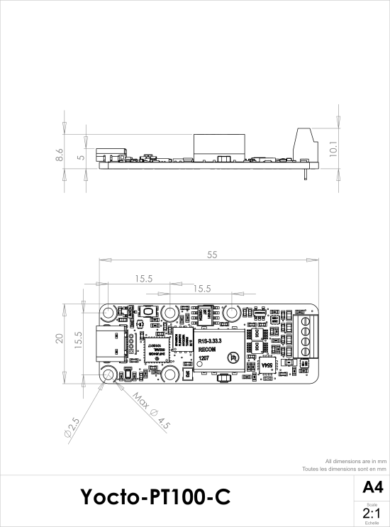 In order to mount the Yocto-PT100-C module, you can put small screws in the 2.5mm assembly holes, with a screw head no larger than 4.5mm. The best way is to use threaded spacers, which you can then mount wherever you want. You can find more details on this topic in the chapter about assembly and connections.