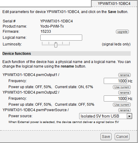 The three functions provided by the Yocto-PWM-Tx module are the "PwmOutput1", "PwmOutput2" and "pwmPowerSource" functions. Simply click on the corresponding rename button to assign a new logical name to one of the functions.