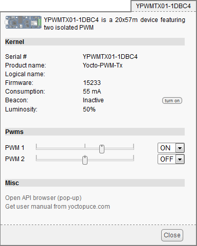 The first item to check is that your module is working well: click on the serial number corresponding to your module. This displays a window summarizing the properties of your Yocto-PWM-Tx.