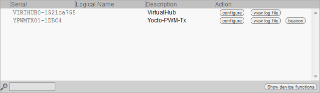 You can then physically localize each of the displayed modules by clicking on the beacon button. This puts the Yocto-led of the corresponding module in Yocto-beacon mode. It starts flashing, which allows you to easily localize it. The second effect is to display a little blue circle on the screen. You obtain the same behavior when pressing the Yocto-button of the module.