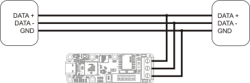 The RS485 input/output port of the Yocto-RS485-V2-C module is a terminal with DATA+, DATA-, and ground contacts. Cabling of an RS485 usually has these three wires, to which devices are cabled in parallel. Sometimes ground is left out from the bus, but this is a design weakness which works only when all the devices have a relatively similar ground. The EIA/TIA-485 standard requires a ground wire.