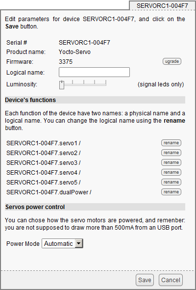 This windows allows you, among other things, to play with your Yocto-Servo module and to check that it is in working order. You can move the cursors corresponding to the different channels, which has the effect of moving the corresponding servos. Note that the power consumption of the module increases greatly when a servo moves when the module uses the USB power supply, while the consumption stays stable when the modules uses an external power supply.