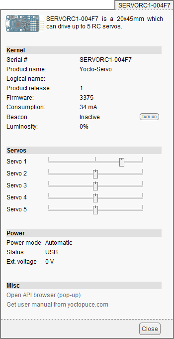 The first item to check is that your module is working well: click on the serial number corresponding to your module. This displays a window summarizing the properties of your Yocto-Servo.