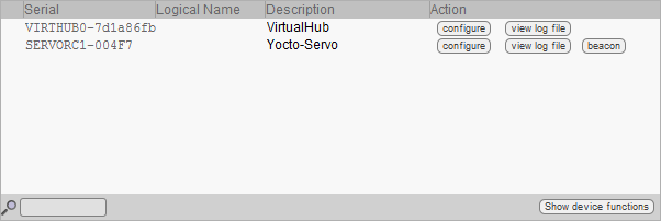 You can then physically localize each of the displayed modules by clicking on the beacon button. This puts the Yocto-led of the corresponding module in Yocto-beacon mode. It starts flashing, which allows you to easily localize it. The second effect is to display a little blue circle on the screen. You obtain the same behavior when pressing the Yocto-button of the module.