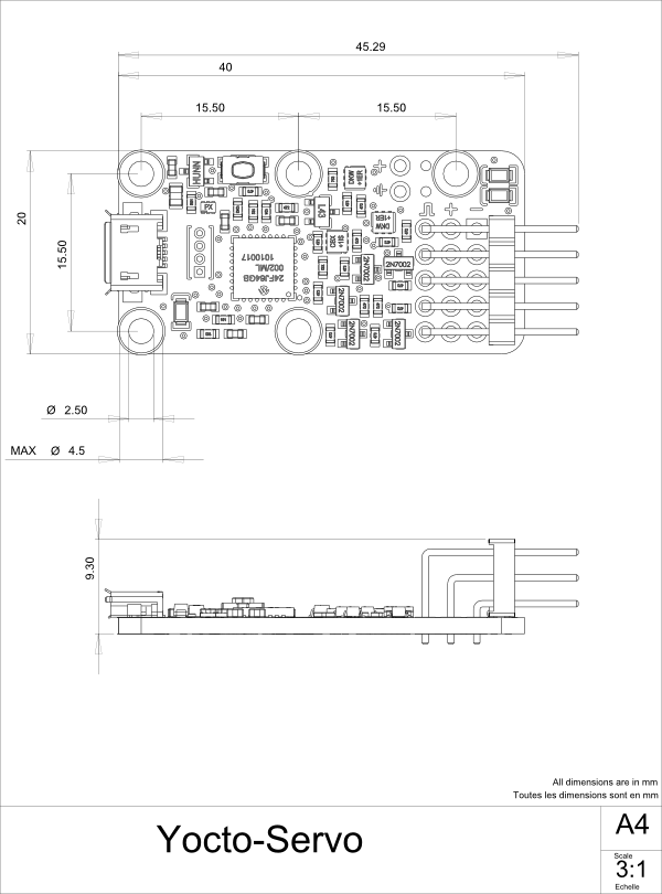 In order to mount the Yocto-Servo module, you can put small screws in the 2.5mm assembly holes, with a screw head no larger than 4.5mm. The best way is to use threaded spacers, which you can then mount wherever you want. You can find more details on this topic in the chapter about assembly and connections.