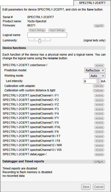 When testing each module, Yoctopuce performs a module calibration with a Spectral-Adapter and a white card, reference RAL 9003. You can return the module to this state at any time by choosing to reapply the factory calibration (Restore factory calibration button).