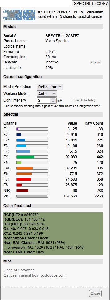 The module enables you to display the measured value on each spectral channel and to indicate the resulting color in several colorimetric spaces, including RGB, HSL, XYZ, and OkLab. It can also classify a color among 11 main categories (brown, red, orange, yellow, green, blue, purple, pink, white, grey, and black) and to identify the closest RAL Classic color and the closest HTML color. The Yocto-Spectral can not only estimate the color of a light source, such as a screen, but also that of a non-light-emitting surface, such as an opaque object lit directly by the Yocto-Spectral.
