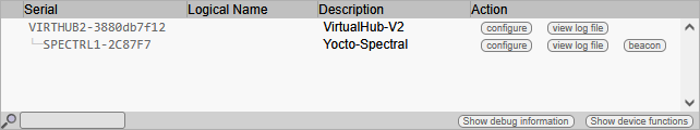 The first item to check is that your module is working well: click on the serial number corresponding to your module. This displays a window summarizing the properties of your Yocto-Spectral.