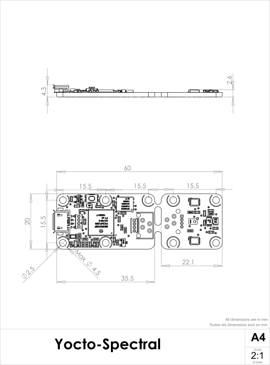 In order to mount the Yocto-Spectral module, you can put small screws in the 2.5mm assembly holes, with a screw head no larger than 4.5mm. The best way is to use threaded spacers, which you can then mount wherever you want. You can find more details on this topic in the chapter about assembly and connections.