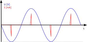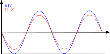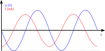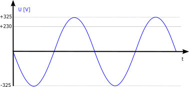 An alternating voltage is a voltage which periodically varies over time. The most usual example is the voltage of the mains. In Europe, the voltage of the mains varies between -325V and +325V about fifty times per second, for an effective voltage5 of 230V. A dynamo such as the one on your bike also produces alternating current.