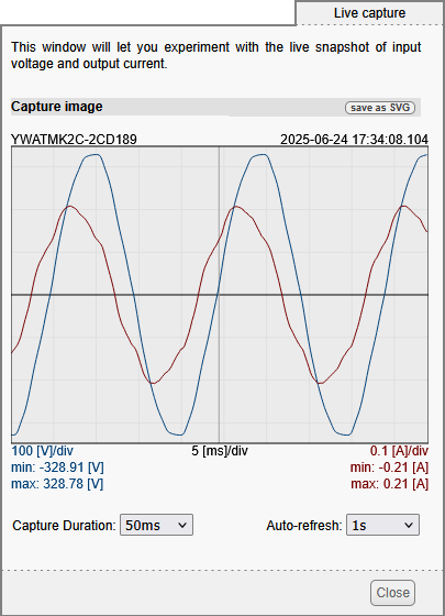 The Yocto-Watt-V2-C works with both DC and AC voltages. In the latter case, the Yocto-Watt-V2-C can calculate the voltage/current offset (cos Φ) and the ratio between the effective power consumed and the apparent power (load factor). Used as a power analyzer, it can provide the periodic profile of current consumption with a resolution of 5.3kHz. It can also capture transient events such as consumption peaks.
