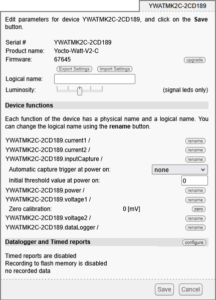 Each Yocto-module has a unique serial number assigned to it at the factory. For Yocto-Watt-V2-C modules, this number starts with YWATMK2C. The module can be software driven using this serial number. The serial number cannot be modified.