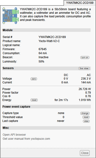 The Yocto-Watt-V2-C is a 58x50mm electronic module which allows you to measure by USB the power consumed by an electrical appliance. This tool is commonly called a wattmeter. It is also able to measure the voltage between two electric wires as well as the current going through a wire. It can also integrate the instantaneous consumption (in Watt) of an appliance to compute its hourly consumption (in Watt * hour).