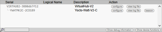 If a firmware update of your Yocto-Watt-V2-C fails, it is possible that the module is no longer working. If this is the case, plug in your module while holding down the Yocto-Button. The Yocto-LED should light up brightly and remain steady. Release the button. Your Yocto-Watt-V2-C should then appear at the bottom of the VirtualHub user interface as a module waiting to be flashed. This operation also reverts the module to its factory configuration.