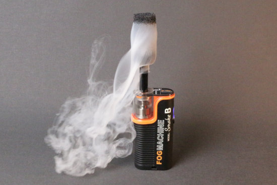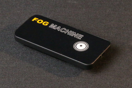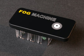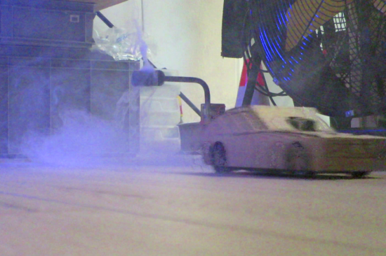 Ce "brouillard" est généré par une petite machine à fumée, mais on s'est très vite rendu compte qu'on ne pouvait pas trop se permettre de la laisser enclenchée pendant tout le tournage de la vidéo. D'une part, on aurait très vite enfumé tous les locaux et d'autre part, si on en abuse, cette fumée laisse un résidu poisseux un peu partout. On a donc très vite cherché à télécommander cette machine à fumée pour qu'elle se mette en marche automatiquement uniquement à l'approche de la voiture.