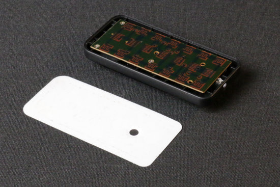 On a démonté cette télécommande. La partie supérieure est en fait un film en plastique facile à décoller. A l'intérieur, il y a juste un PCB avec quelques composants radio et des touches directement imprimées sur le PCB. Visiblement, ce PCB est une pièce générique destinée à plusieurs utilisations parce qu'il y a 21 (!?) touches prévues, alors que notre télécommande n'en utilise qu'une.