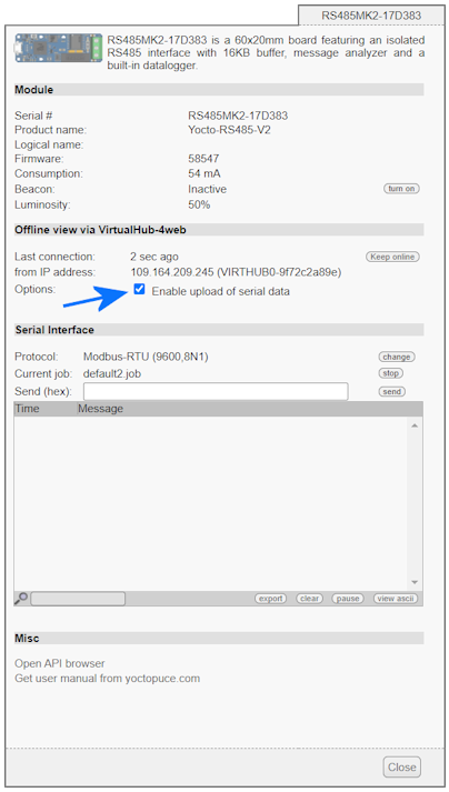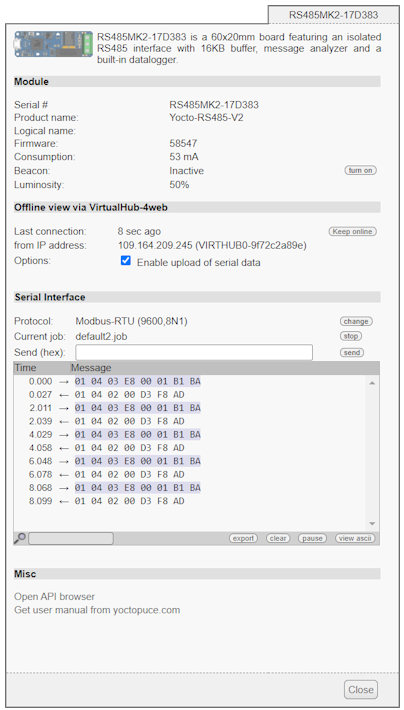 Mais si le réseau sur lequel se trouve le système MODBUS n'est pas joignable depuis l'extérieur, il faut définir un job d'interrogation autonome sur le Yocto-RS485-V2 et utiliser par VirtualHub for Web pour remonter les données sur un serveur accessible depuis l'extérieur: