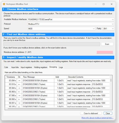 A titre d'exemple, voici ce que produit la sortie de notre utilitaire ModbusTool si on le lance en ligne de commande en indiquant l'URL d'un serveur VirtualHub for Web comme interface à surveiller, et qu'on active l'onglet Snooping: