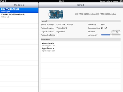Comme vous le savez, nous fournissons déjà une API en Objective-C qui permet d'accéder à nos modules depuis un Mac. Il y a d'autres machines qui utilisent l'Objective-C, ce sont les iPhone, iPad et iPod. Si, actuellement, il n'est pas possible de brancher directement un module Yoctopuce sur un device IOS, il est tout à fait possible d'interagir avec nos modules par le réseau (Wifi ou filaire). Que diriez-vous de monitorer tous vos modules Yoctopuce confortablement depuis votre canapé avec un iPad ?