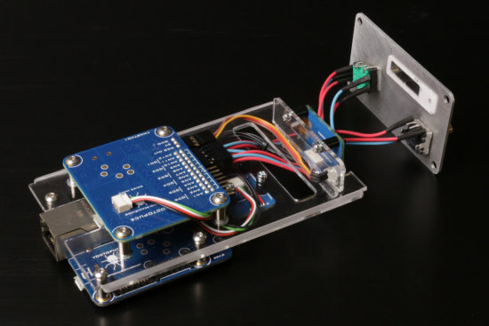 Pour obtenir un montage propre, les différents éléments sont fixés sur une plaque de verre acrylique qui se glisse dans le boîtier. Il a fallu couper le Yocto-MiniDisplay en deux pour pouvoir placer la partie écran juste en face de la fenêtre de la façade. Les modules sont interconnectés avec des câbles 1.27-1.27-11 et les boutons sont connectés au Yocto-MaxiKnob à l'aide de câbles Dupont.