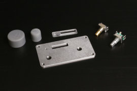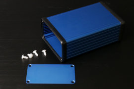Pour le boîtier, on a choisi un boîtier 1455k120BU de Hammond. Plutôt que d'utiliser les façades et le système de fixation d'origine, on a taraudé les trous du boîtier et on a découpé de nouvelle façades dans du l'aluminium 1.5 mm qu'on fixe avec des vis M4 a tête (très) plates. On a taillé une petite vitre pour l'écran et la LED dans du verre acrylique 2mm avec une fraiseuse CNC. Les encodeurs sont fixés sur la façade. Les boutons eux-mêmes ont été fabriqués avec une imprimante 3D à résine.