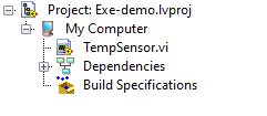 Supposons que l'on ai un projet tout simple qui contienne un VI nommé "TempSensor" qui lit et affiche la température d'un capteur Yoctopuce.