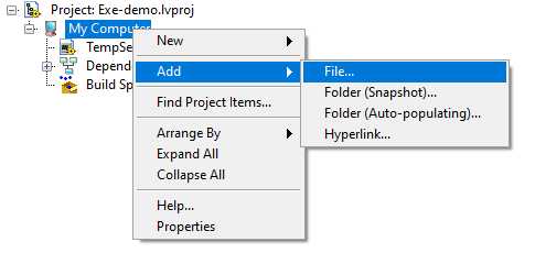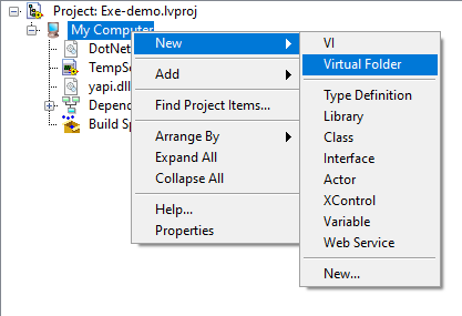 Commençons par signaler à LabVIEW que le projet a besoin de DLL. Un clic droit sur le nœud my computer permet d'ajouter les fichiers yapi.dll et DotNetProxyLibrary.dll qui se trouvent dans le répertoire C:\Program Files\National Instruments\LabVIEW XXXX\vi.lib\Yoctopuce\VIs, si vous avez installé la librairie Yoctopuce avec l'installeur fourni.