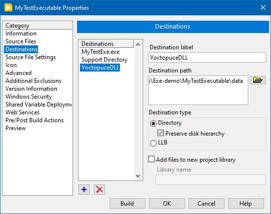 Il s'agit maintenant d'expliquer à LabView comment il doit copier les DLL, pour cela on crée dans la section Destinations une nouvelle destination que l'on va appeler "YoctopuceDLL" et qui aura le même chemin de destination que l'entrée "Support Directory", mais avec la case "Preserve disk hierarchy" cochée.