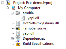 Ajoutons la version 64 bits de yapi.dll dans le répertoire que l'on vient juste de créer. Cette DLL se trouve dans le répertoire C:\Program Files\National Instruments\LabVIEW XXXX\vi.lib\Yoctopuce\VIs\amd64. La structure de votre projet doit maintenant ressembler à l'image ci dessous.