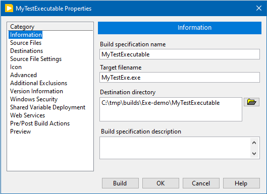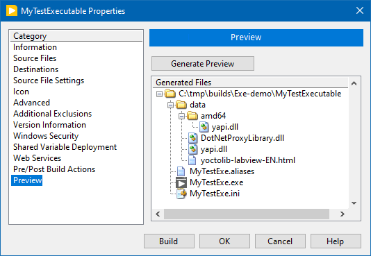 Après une compilation on trouve dans le répertoire builds un fichier exécutable MyTestExe.exe, quelques fichiers annexes et un répertoire data que l'on pourra copier et lancer sur n'importe quelle machine pour peu que l'environnement LabVIEW runtime y soit installé.