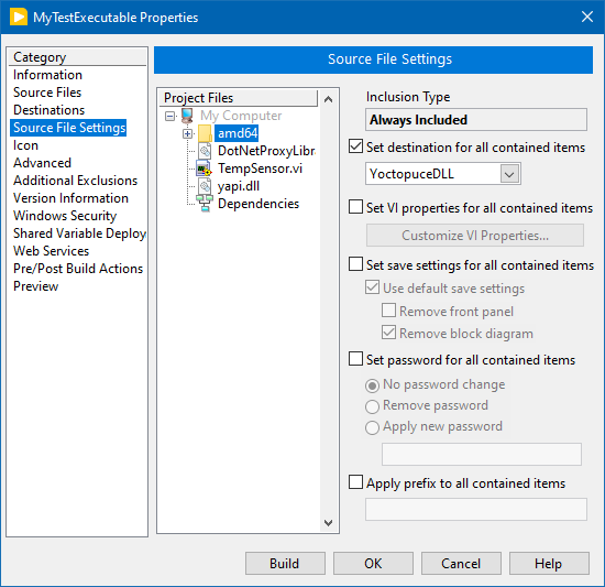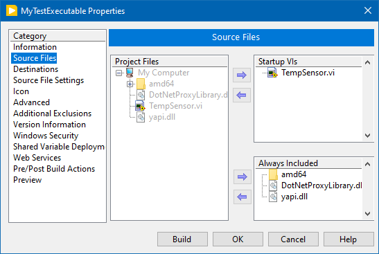 Signalons maintenant à LabView dans la section "Source files" qu'il doit copier les DLL DotNetProxyLibrary.dll,yapi.dll et le répertoire amd64.