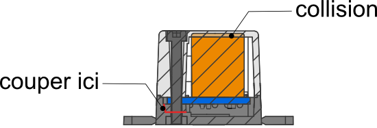 En effet, comme on le voit ci-dessus, nous avions prévu un petit espace de sécurité entre le circuit et la base du boîtier, pour les contacts traversant ou le passage éventuel de petits fils. Le Yocto-LatchedRelay comporte bien des contacts traversant, mais ils sont toujours coupés afin de ne pas trop dépasser. On peut donc envisager de réduire dans ce cas l'espace de sécurité.