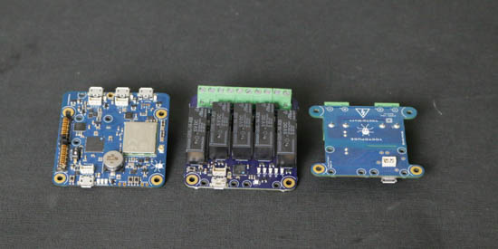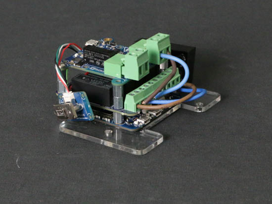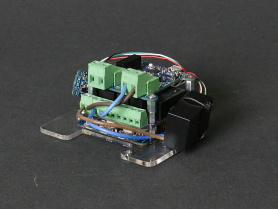 On a ensuite empilé le YoctoHub-Wireless-n, le Yocto-MaxiPowerRelay ainsi que le Yocto-Watt à l'aide de Fix-3x8mm. Pensez à brancher au fur et à mesure les câbles 1.27 et le câble de l'antenne WiFi, car une fois que tout est monté, l'accès aux prises est très compliqué.
