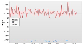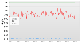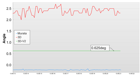 Première observation: Le capteur Murata en bleu est sans aucun doute le plus précis en valeur absolue. C'est le seul qui retourne un valeur dans la plage attendue, les autres ont clairement un offset non-négligeable entre 1° et 3°.