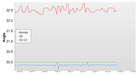 La fonction inclinomètre du Yocto-3D est basée sur la même technologie d'accéléromètre que le capteur Murata SCL3300, mais avec un capteur moins évolué. Il peut être donc être utilisé comme inclinomètre pour les applications nécessitant une précision de l'ordre de 2° seulement. Une utilisation moyennée, par l'utilisation de timed reports à 30 ou 60 mesures par minute, pourra considérablement réduire le bruit de mesure, et une recalibration soignée aidera aussi pour la précision absolue.