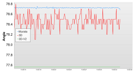 Le capteur Murata tient fidèlement l'angle. Le Yocto-3D reste assez bruité mais tient un décalage assez cohérent. Le Yocto-3D-V2 lui donne une mesure stable mais qui peut s'écarter de plus 2° de la réalité, d'un côté ou de l'autre. Cette erreur variable est très probablement produite par l'intégration gyroscopique qui est utilisée par l'algorithme de fusion du BNO055.