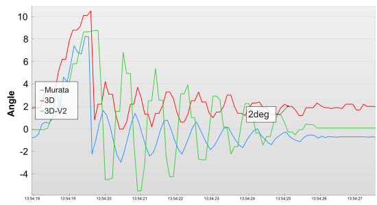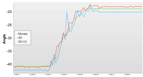 Le résultat est très différent des précédents tests. Le capteur Murata produit des valeurs très bruitées pendant la transition, probablement en raison de la saturation du capteur. Le Yocto-3D et le Yocto-3D-V2 donnent eux une estimation bien plus correcte du mouvement, ce dernier produisant les meilleurs résultats.
