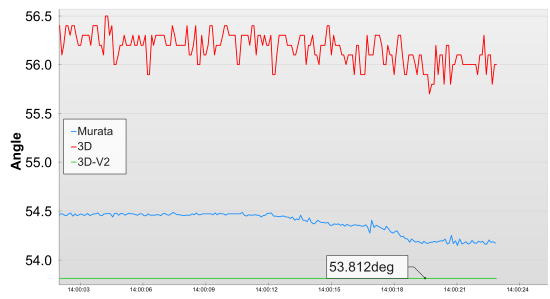 La fonction inclinomètre du Yocto-3D-V2 est en réalité une sortie angulaire de l'estimation d'orientation intégrant non seulement des mesures d'accéléromètre mais aussi la fonction gyroscopique. Elle est donc meilleure pour l'estimation des changements rapides d'angle et la stabilité, mais pas très bonne en terme de répétabilité, donc au final pas meilleure que le Yocto-3D en terme de précision absolue.