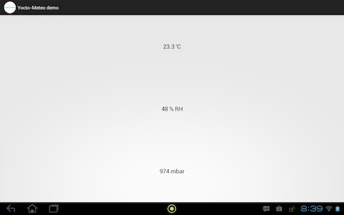 Maintenant que nous avons une tablette qui supporte le "Host mode", une librairie Java prévue pour Android, regardons comment interagir avec un Yocto-Meteo. Nous allons créer une app très basique qui affichera les trois valeurs des trois sondes du Yocto-Meteo connecté ou un message "Not connected" si le module n'est pas branché.