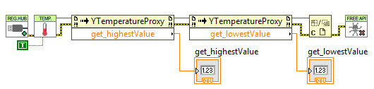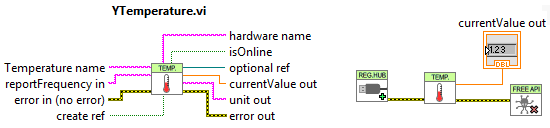 Les VIs Yoctopuce ont été conçus pour donner un accès immédiat aux propriétés qu'on a jugé les plus importantes pour chaque classe. Par exemple, la lecture d'un capteur de température se fait de manière assez immédiate: